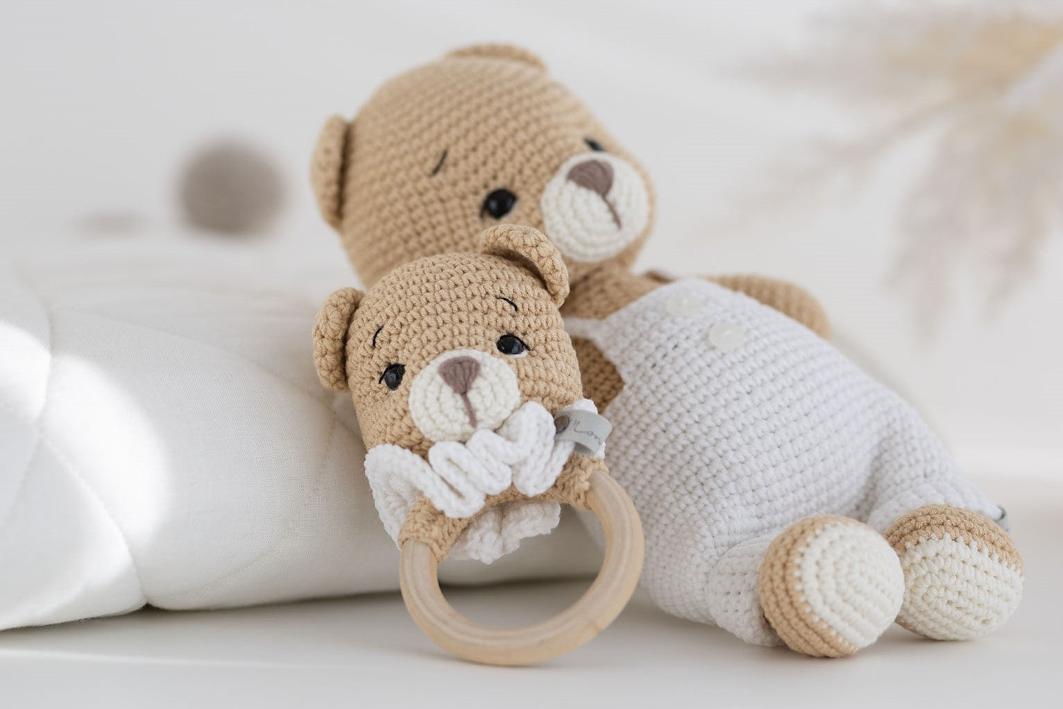Prie barškučio puikiai dera didelis nertas žaisliukas "Bičiulis"!
