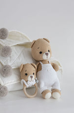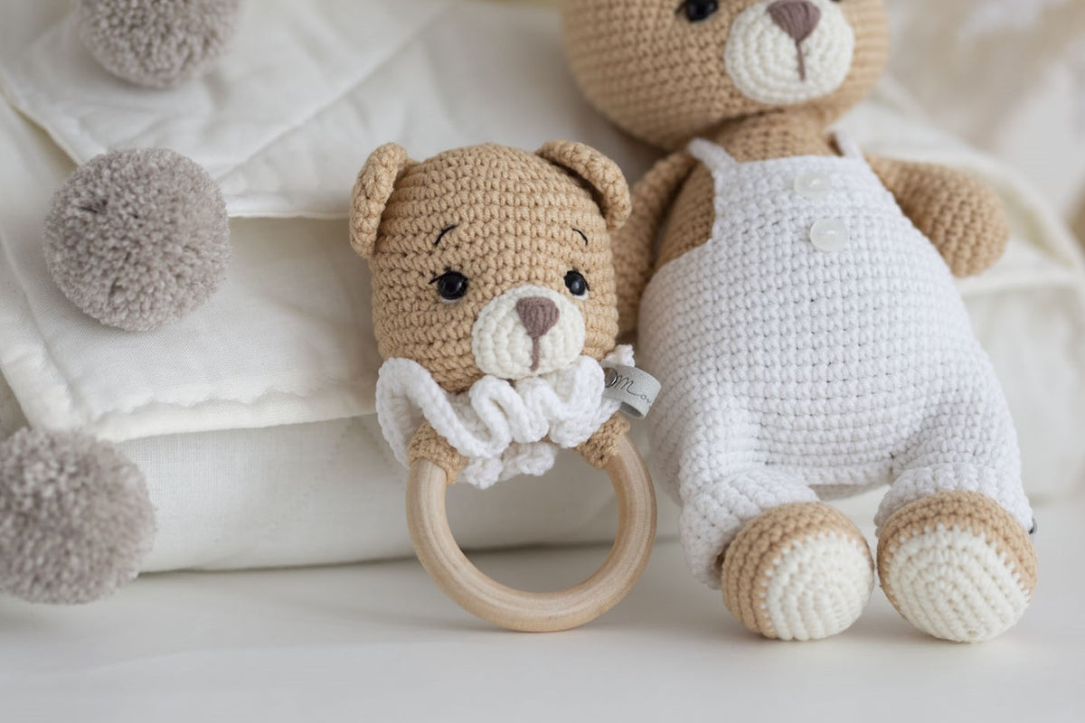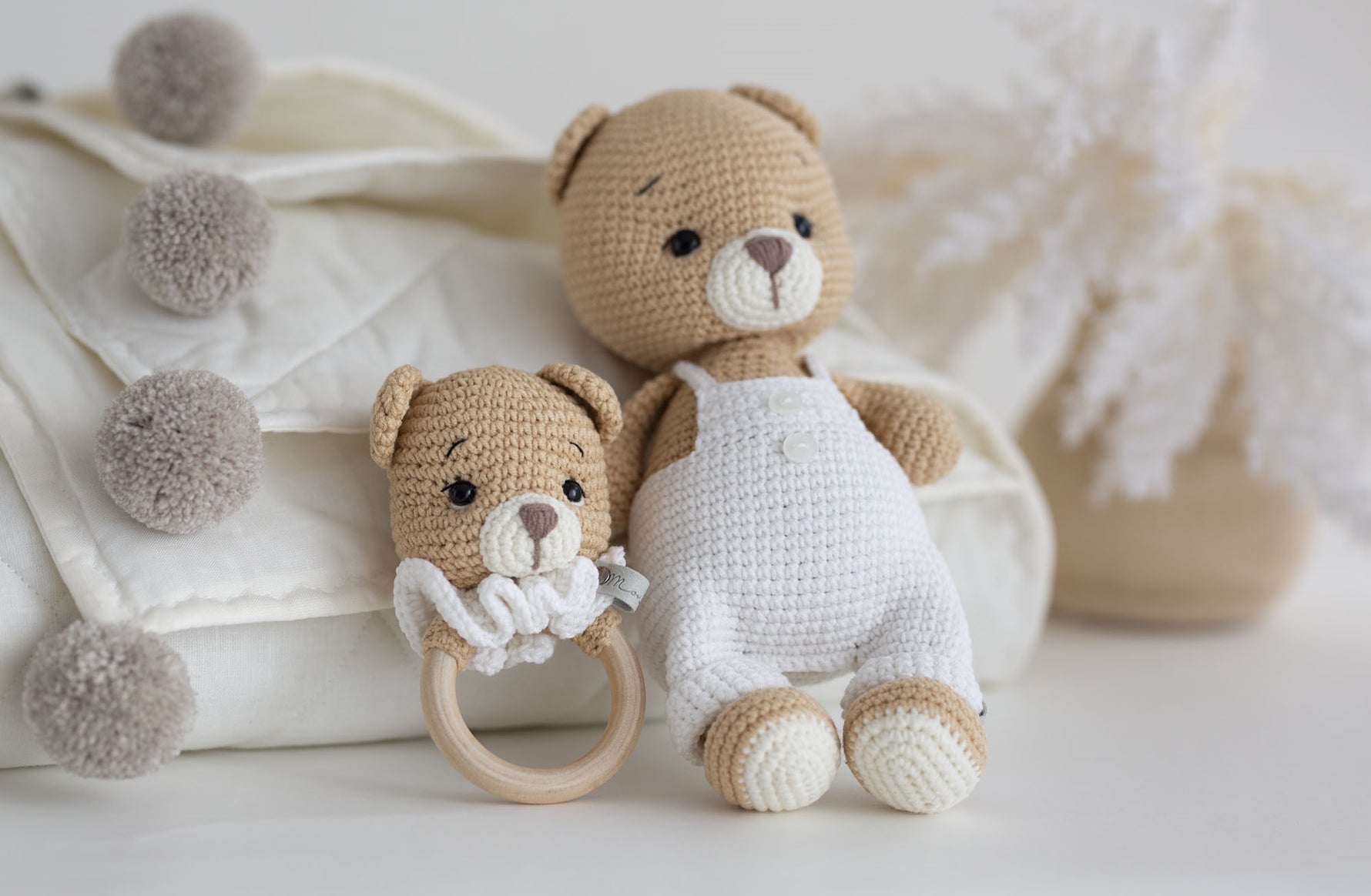 Nertas kramtukas - barškutis „Bičiulis” mielas ir gražus rankų darbo žaisliukas. Jis lengvas ir patogus laikyti mažoms rankutėms. Šis jaukus nertas žaisliukas gali būti  dovana gimtadienio, Kalėdų ar laukimo (baby shower) šventės metu. Meškučio formos kramtukas - barškutis yra nertas vąšeliu, kurio raštas skatina mažylio pirštukų motoriką.