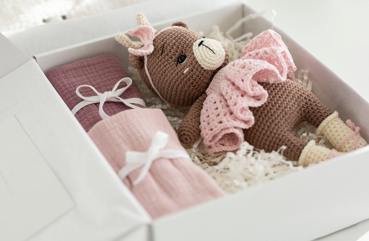 • 2 dvigubi muslino merliukai "Pelenų alyvinė rausva" ir "Tamsiai pelenų rausva" (30x30 cm) – itin minkšti, kvėpuojantys ir švelnūs kūdikio odai.