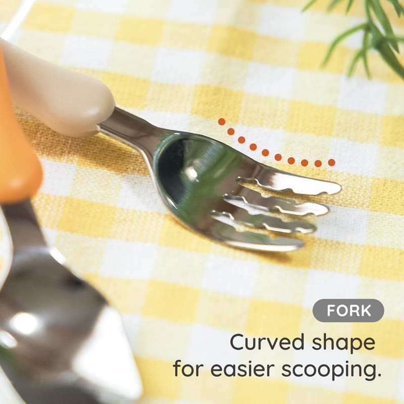 Specialiai mažo vaiko rankai sukurto ergonomiško kotelio dėka šakutę ir šaukštą lengva suimti ir laikyti įvairiose pozicijose.