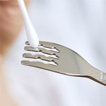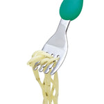 Specialiai mažo vaiko rankai sukurto ergonomiško kotelio dėka šakutę ir šaukštą lengva suimti ir laikyti įvairiose pozicijose.