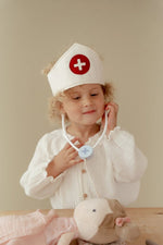 Daktare, ar galite apžiūrėti? Su šiuo mediniu gydytojo rinkiniu jūsų mažylis bus visiškai pasiruošęs rūpintis pacientais. Medžiaginėje gydytojo rankinėje yra visos būtinos medicinos priemonės, tokios kaip termometras, švirkštas, tvarsčiai, stetoskopas ir kraujospūdžio matuoklis. Rinkinyje yra net gydytojo kepuraitė! Puikiai tinka lavinti vaizduotę ir susipažinti su gydytojo vizitais. Kas kitas pacientas?