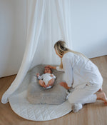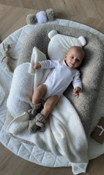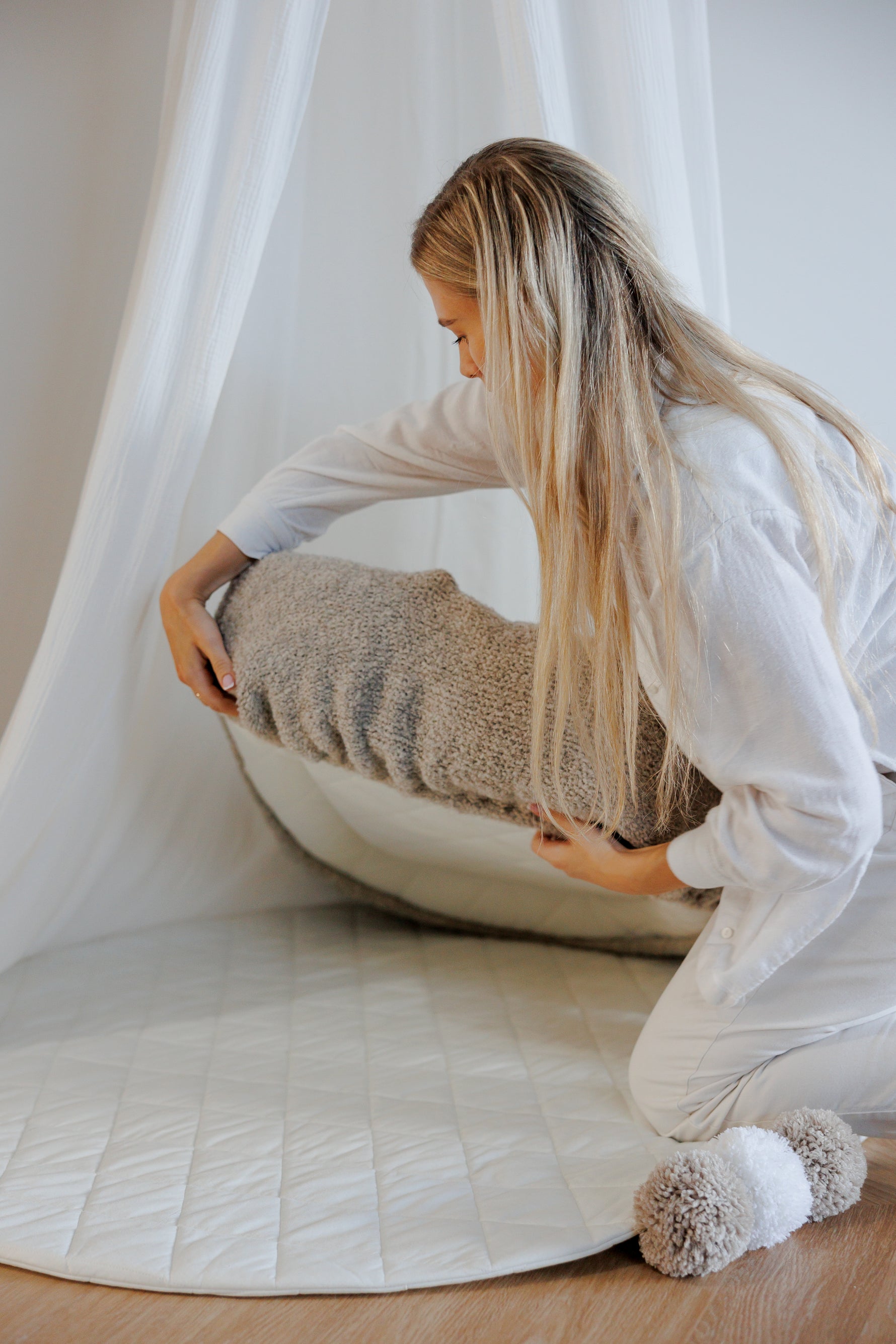 Lizdelio užvilkimas lengvai užsideda, o elastinė guma užtikrina, kad jis saugiai priglus prie lizdelio kraštų, nejudės ir išliks savo vietoje. Neutralios, švelnios spalvos ir subtilus tekstūros dizainas puikiai dera su įvairia kūdikio kambario aplinka, sukurdamas šilumos ir ramybės atmosferą.