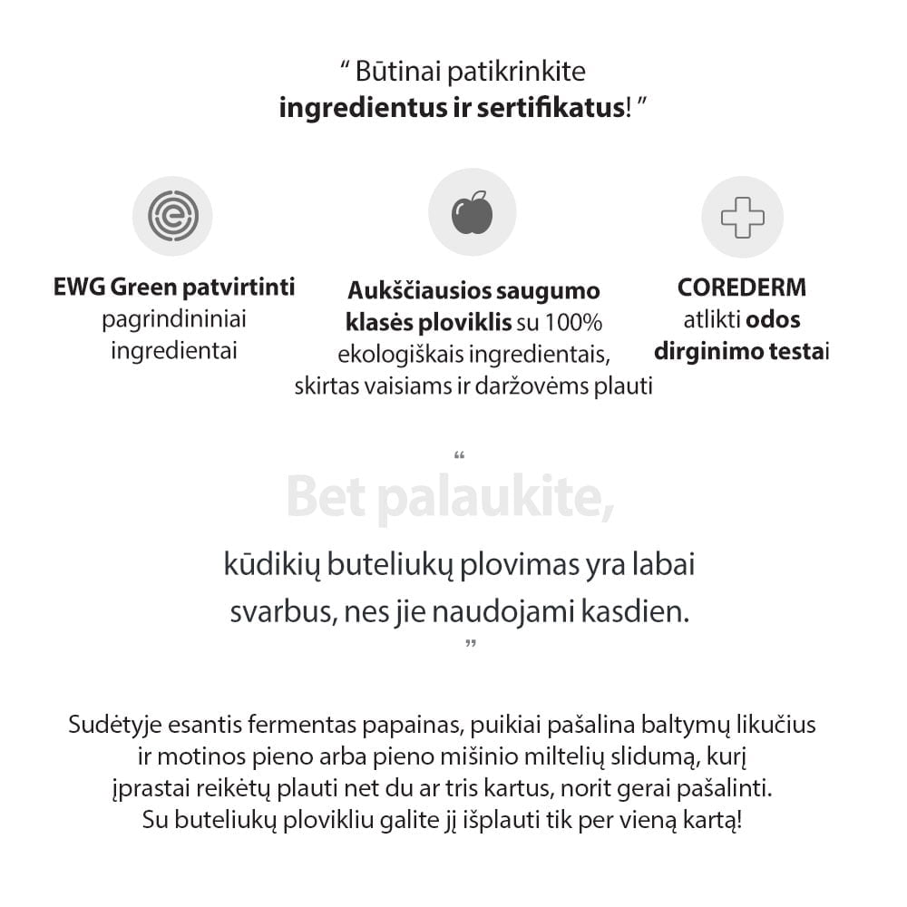 3. Natūralios kilmės paviršinio aktyvumo medžiagos kukurūzai ir cukranendrės. 1 klasės saugus ploviklis 100% natūralių ingredientų daržovėms plauti. Be kvapų ir pigmentų.