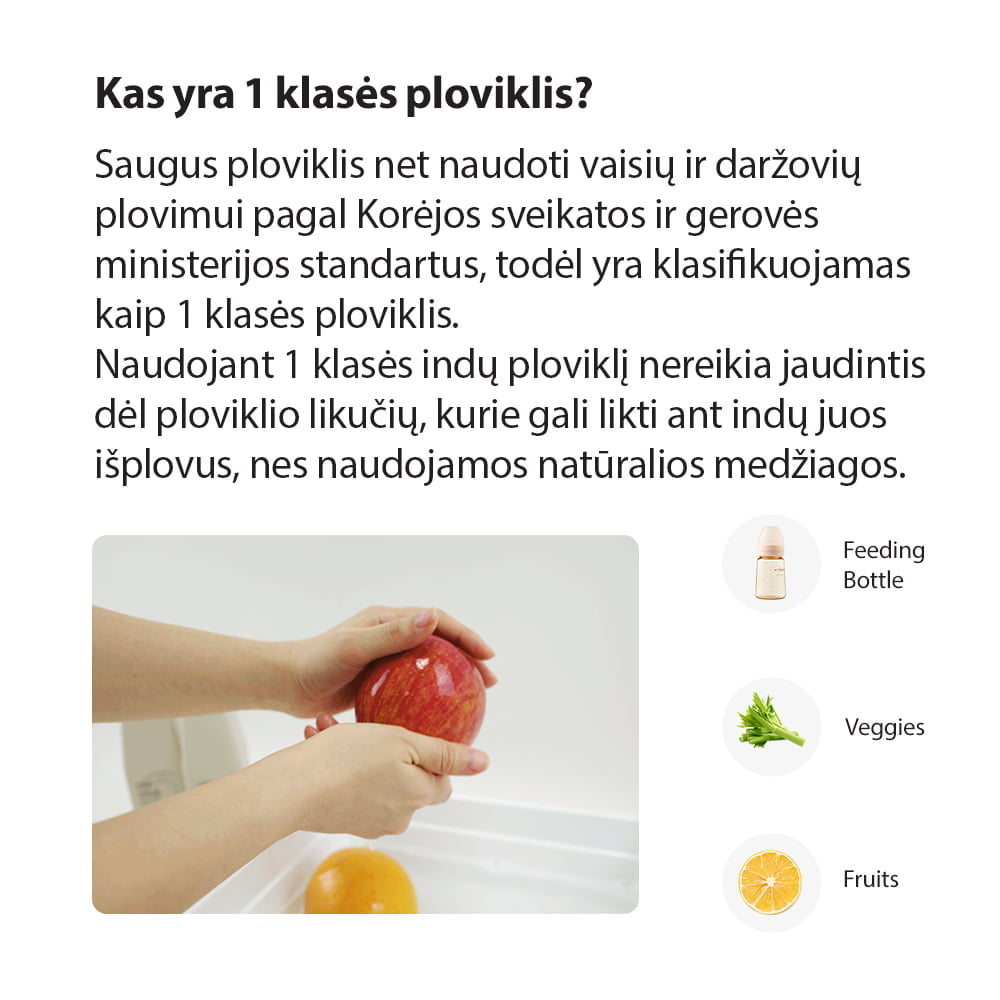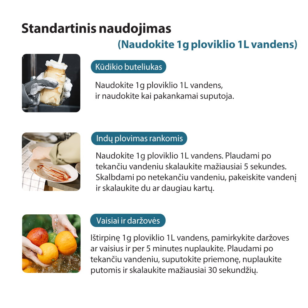 1. Į indą su 1L vandeniu įpilkite 1g ploviklio, išmaišykite ir sudėkite vaisius ar daržoves. Palaikykite 5min. ir gerai nuplaukite po tekančiu vandeniu.