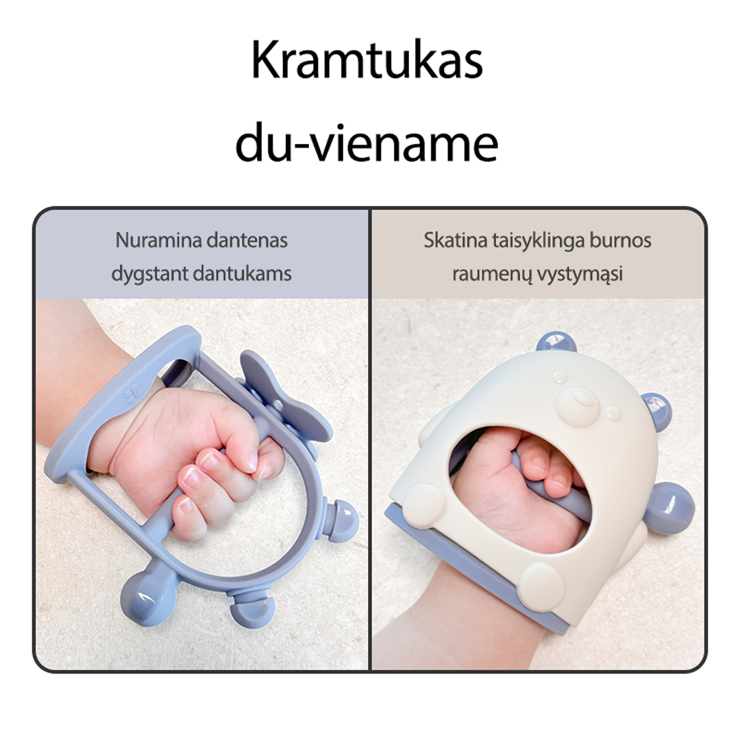 Šis kramtukas sukurtas taip, kad mažyliui būtų patogu jį paimti ir laikyti rankytėje. Minkštas silikonas švelniai apgaubia riešą, todėl kramtukas neiškrenta, net kai kūdikis aktyviau juda.