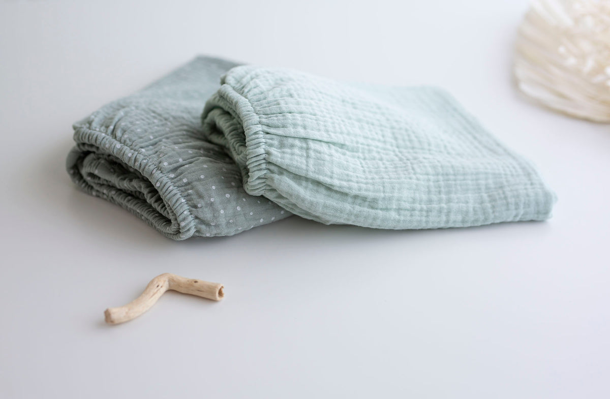 Muslino paklodė su guma "Mėtinė su baltais taškiukais. Šviesiai mėtinė"