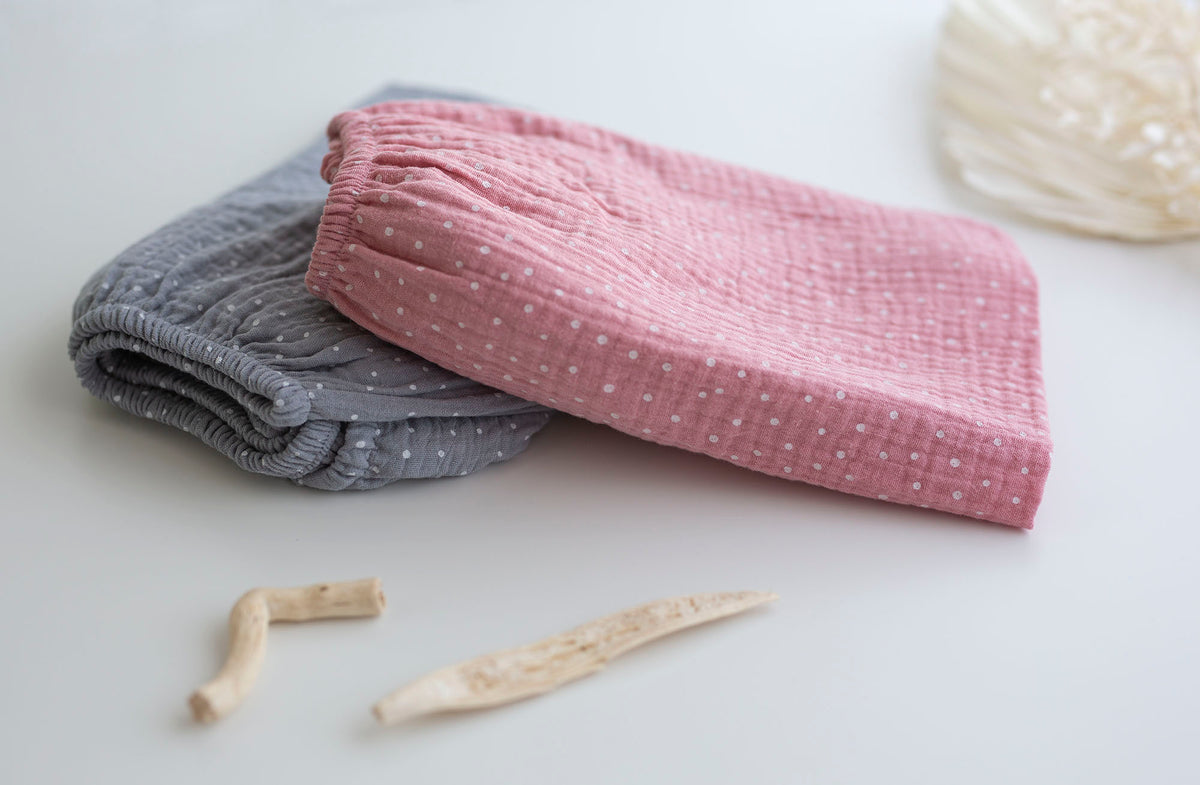 Muslino paklodė su guma "Rausva su baltais taškiukais. Pilka su baltais taškiukais"