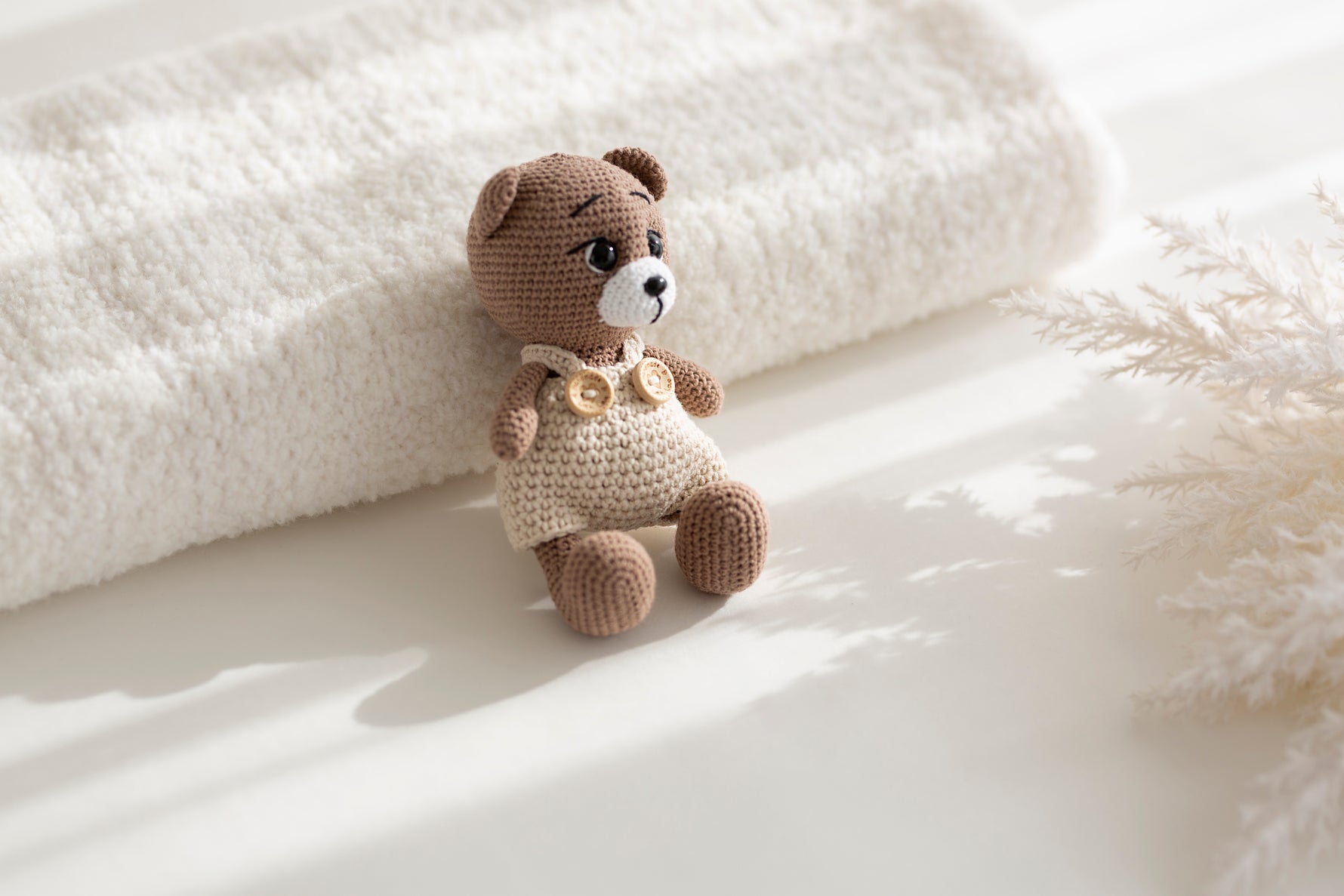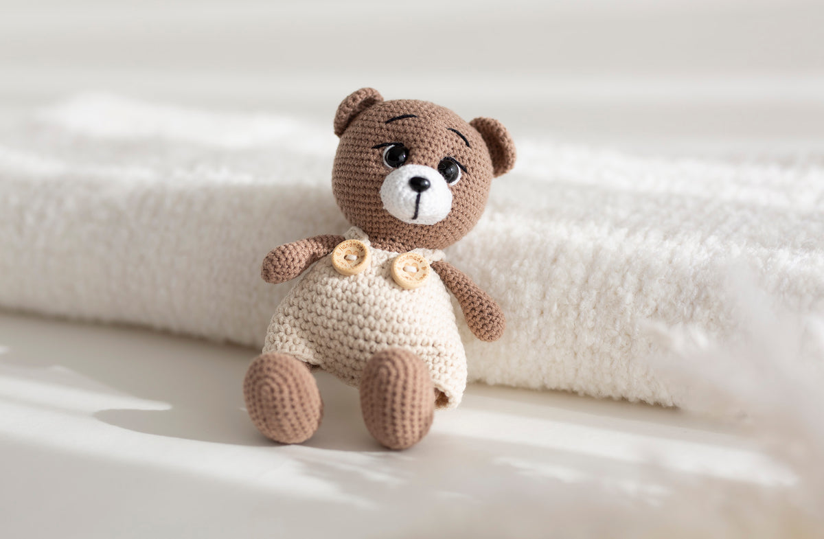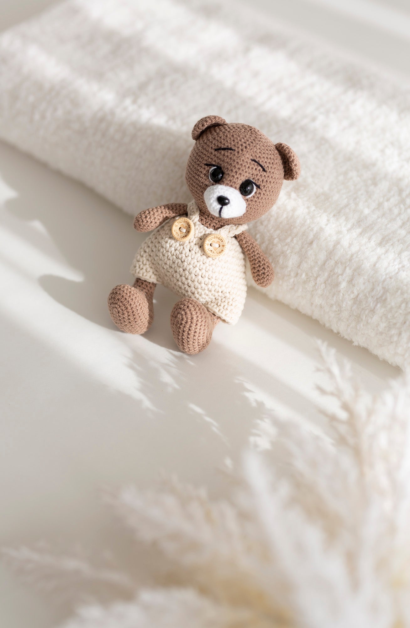 Nertas medvilninis meškiukas su kombinezonu - malonus liesti ir patogus laikyti kūdikiui. Draugystė su šiuo meškučiu bus švelni ir saugi.