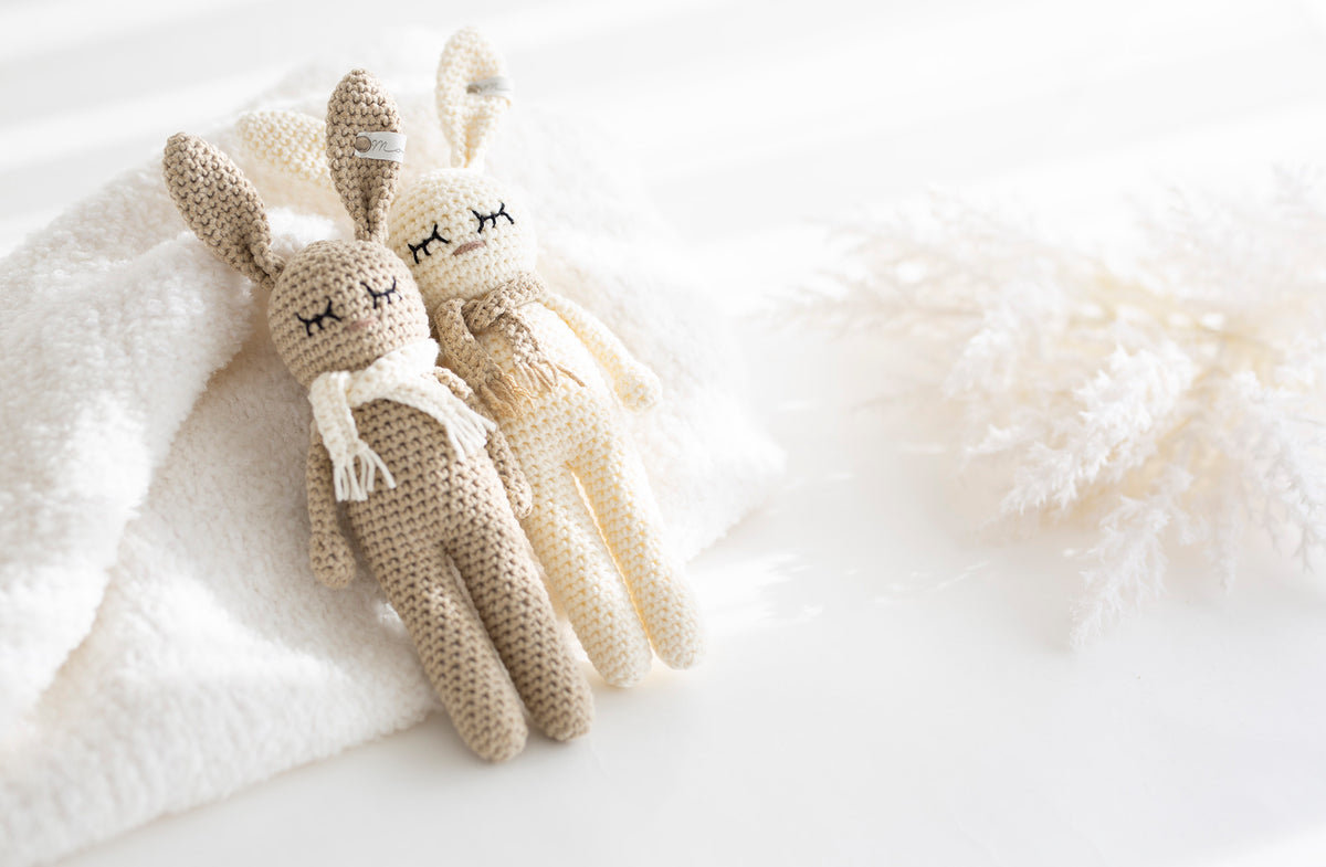Nertas medvilninis zuikutis - malonus liesti ir patogus laikyti kūdikiui. Draugystė su šiuo zuikučiu bus švelni ir saugi.